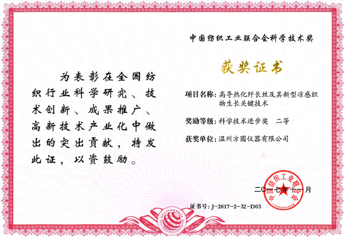 溫州方圓儀器榮獲二項(xiàng)“紡織之光”2017年度科學(xué)技術(shù)進(jìn)步獎二等獎